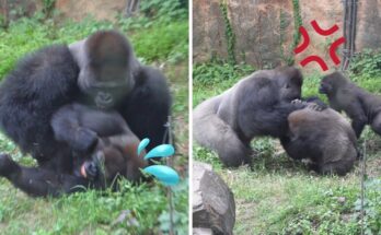 In this video, we witness a startling yet natural scene within the famous Momotaro gorilla family. Baby Kintaro, full of innocence and curiosity, suddenly finds himself caught off-guard when his …