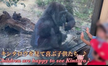 This video captures an absolutely adorable scene at the zoo, where Kintaro, a young gorilla from the famous Momotaro family, interacts joyfully with a group of visiting kindergarteners. The children, …